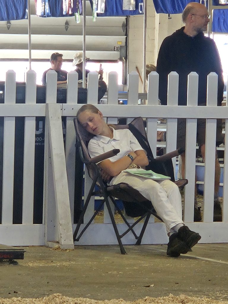 Amanda took 6 goats to show in the youth show, but only 1 milker. Porsche is Amanda’s milker and showmanship goat because Amanda loves her, but Porsche hates her job. She is hard to clip and kicks HARD when you try to do anything to her back legs. Porsche also hates when the judge tries to touch her. Friday included the fitting and showmanship competitions where Amanda was in the 2nd oldest group of 13 youth; she placed 6th in both fitting and showmanship.
