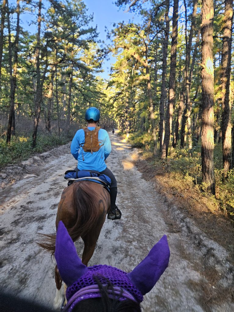 The temps steadily warmed on the first loop and we all shed our outer layer before arriving at the hold; we did the 18 miles at a solid 6.5 mph. The 45 minute hold was uneventful – the horses vetted fine and we had a quick break. We headed back out for the second loop of 12 miles and had an extra rider with our group. A new rider was there with a friend and the friend’s horse got pulled. We had all been back and forth during the first loop and so pacing wasn’t expected to be a problem. Our group of 4 headed back out for more sandy trails.