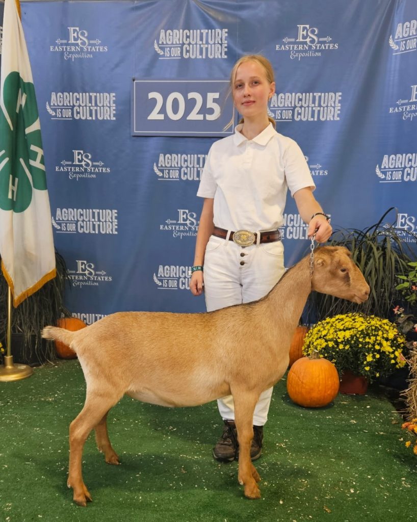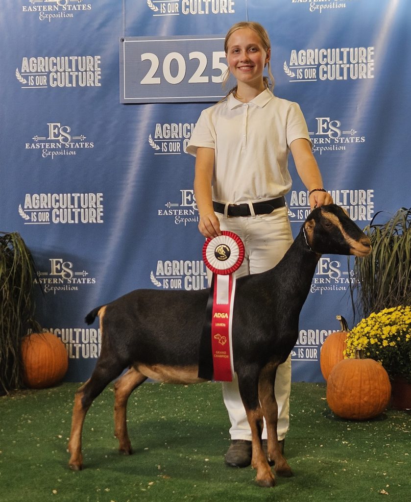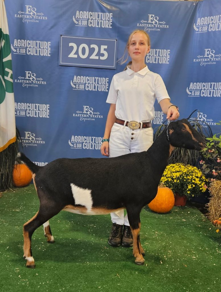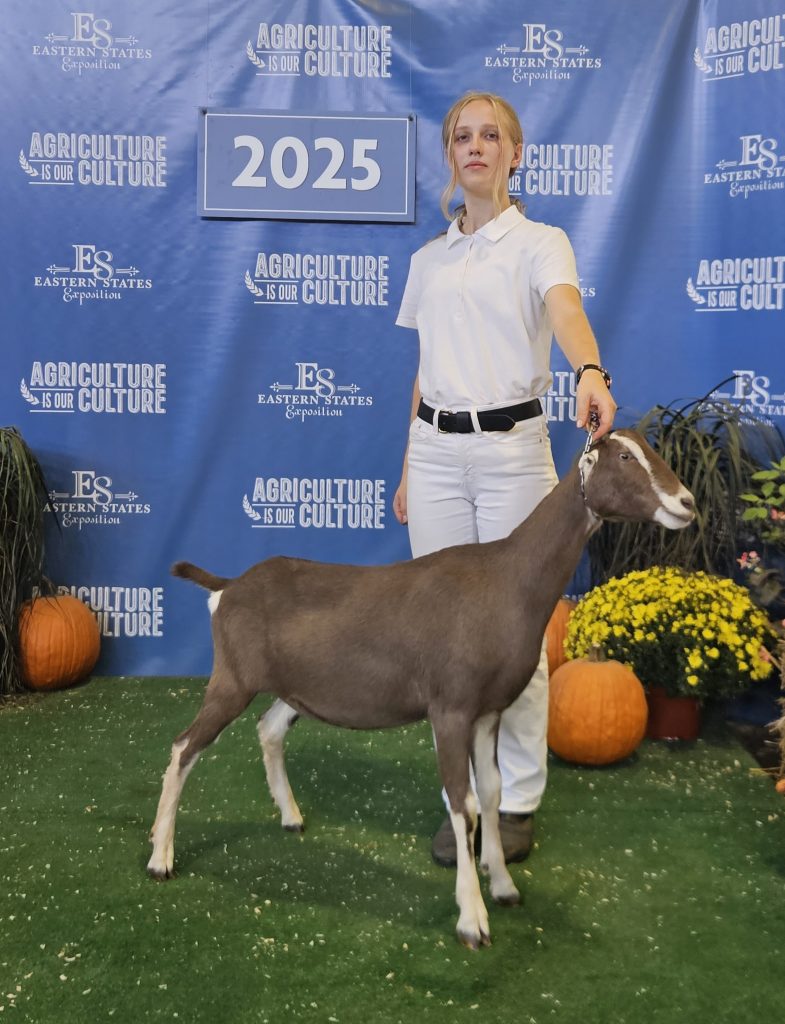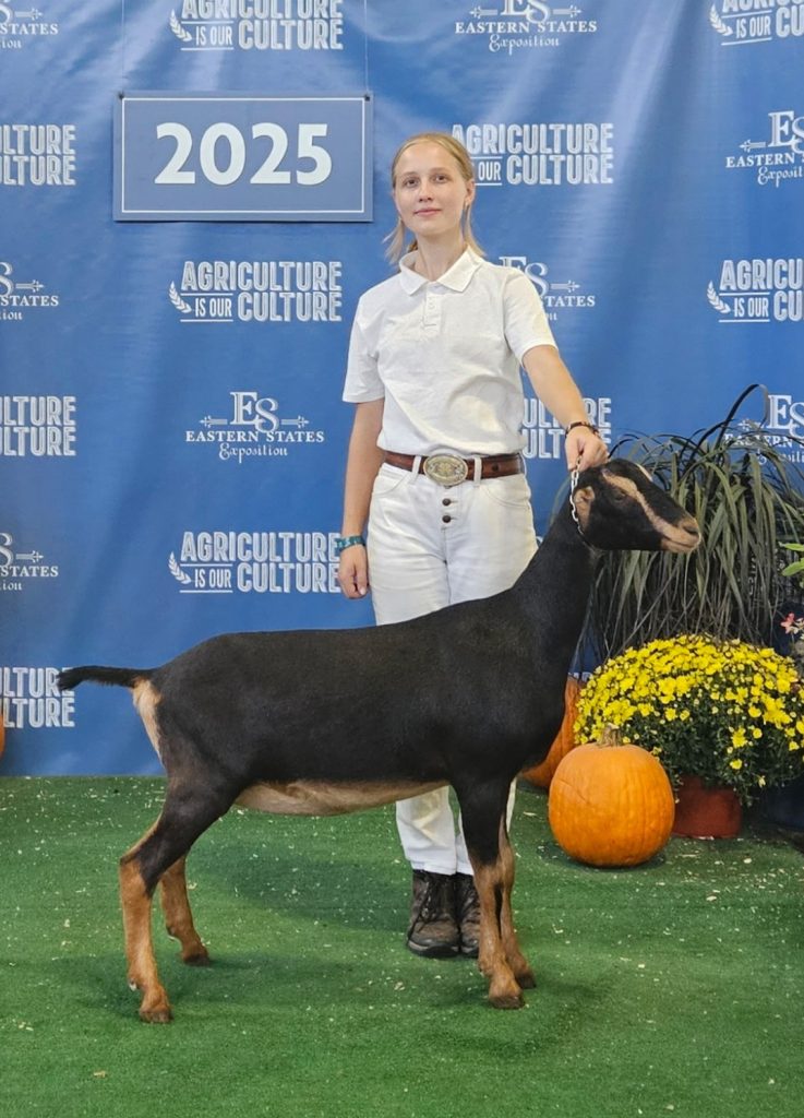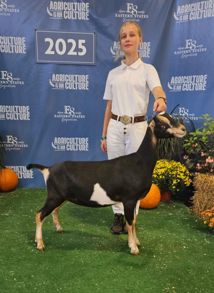 Mina is Phaylene’s daughter from 2024. Mina is a broken black and tan doe. Mina won her dry championship leg at the Big E in 2024. Mina is staying a dry yearling for 2025.