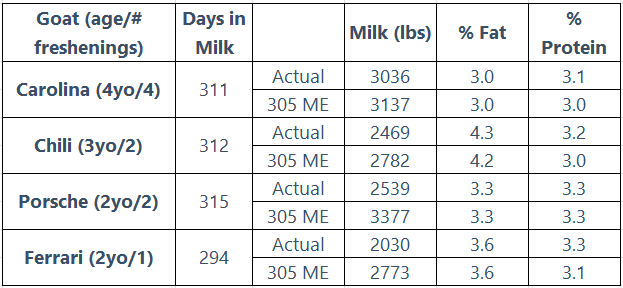 We have a solid milking herd. Carolina produced 353 gallons of milk in 311 days. Porsche is a rockstar and should continue to show higher production in the coming years as indicated by her 305 ME numbers. If we just want a batch of cheese, we should use Chili’s milk. Sticking with milk test should result in milk stars on pedigrees in most of our does. We learned a lot and will be sticking with it.